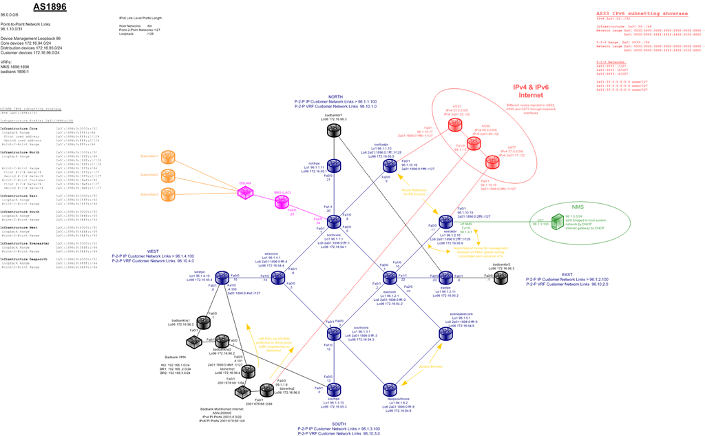 To get some prefixes into the BGP table there are a couple of loopback interfaces on the devices AS33, AS77 and AS99 which are redistributed. Those three devices run BGP. AS33 and AS77 have a peering with AS1896.